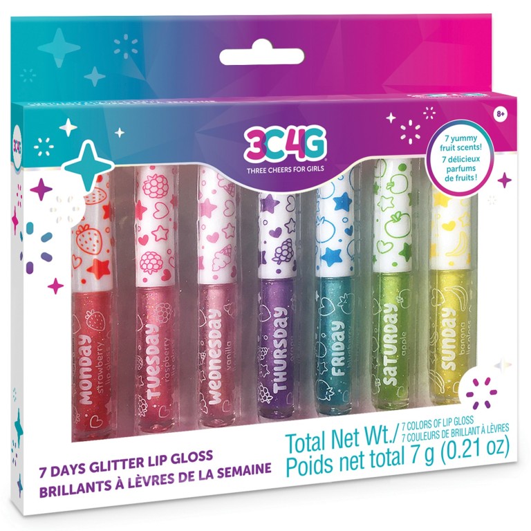 Σετ lip gloss με 7 διαφορετικά χρώματα και γεύσεις: φράουλα, βατόμουρο, βανίλια, σταφύλι, μύρτιλο, μήλο και μπανάνα.